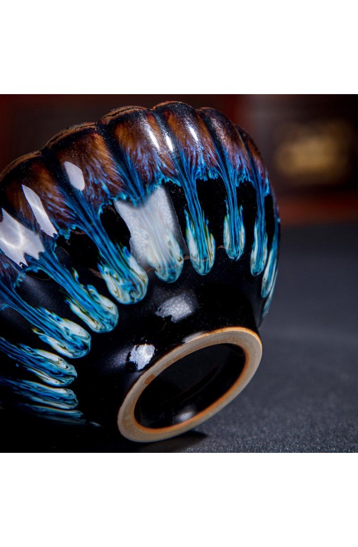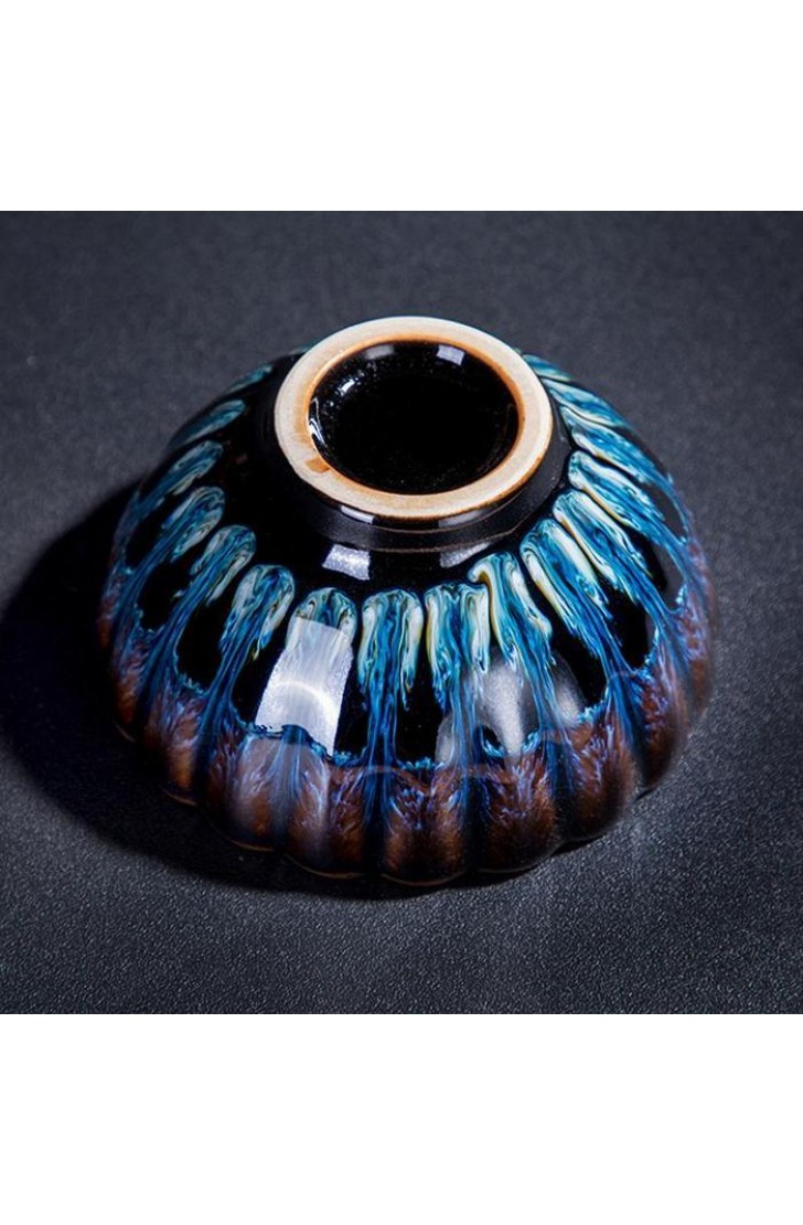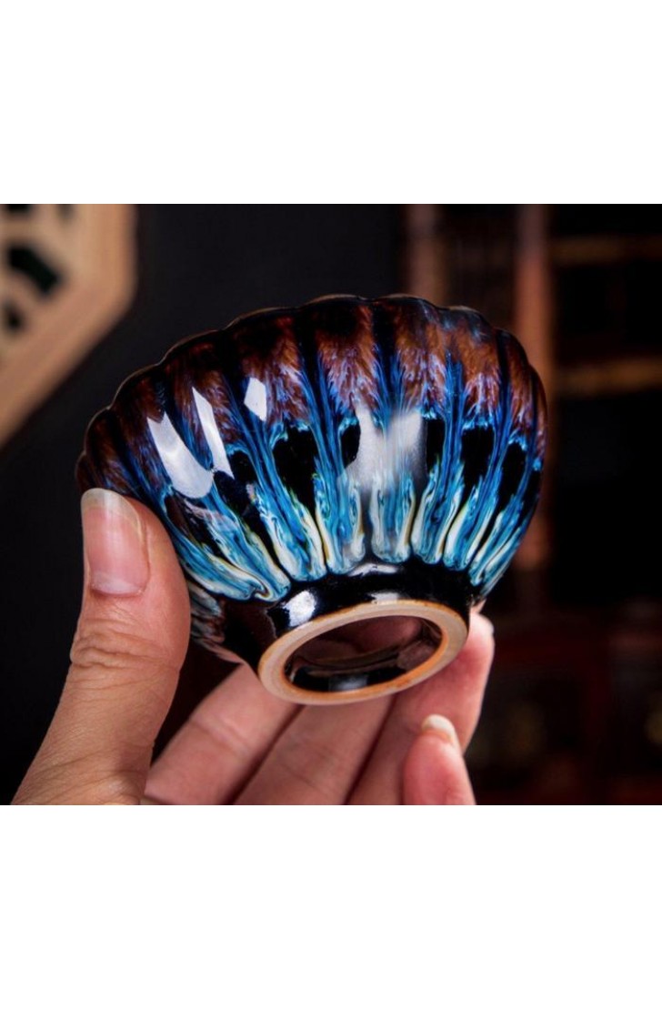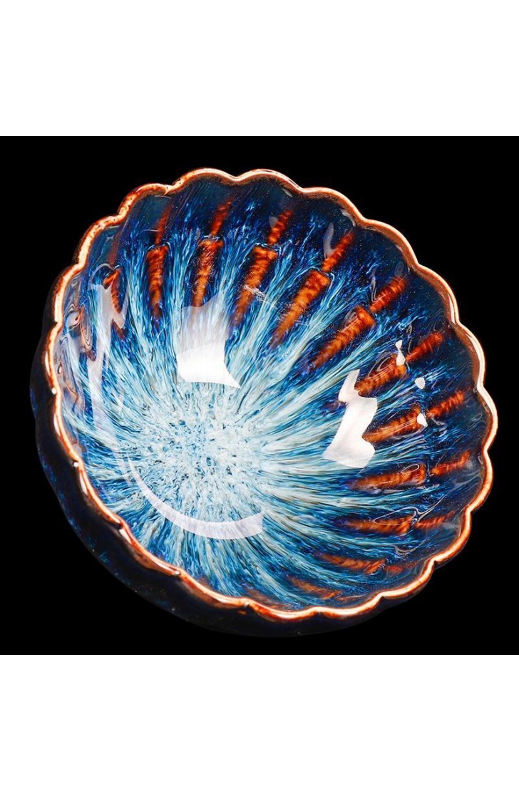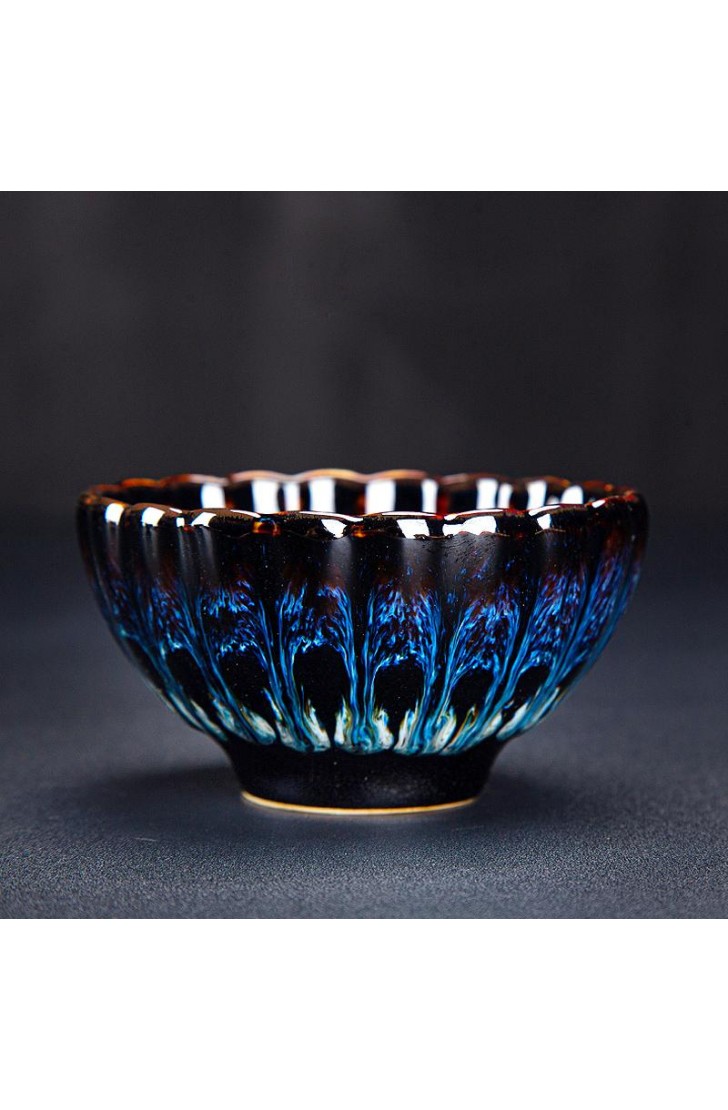 Elevate your tea ritual with the Kui Mouth Kiln-Changed Tea Bowl—a stunning piece of traditional Chinese ceramic art, handcrafted with premium materials. This 130ml teacup features unique blue-brown flow glaze patterns, created by high-temperature kiln transformation, with a delicate kui mouth (flower-shaped rim) design. The optional silver lotus inlay adds a touch of elegance and cultural significance.